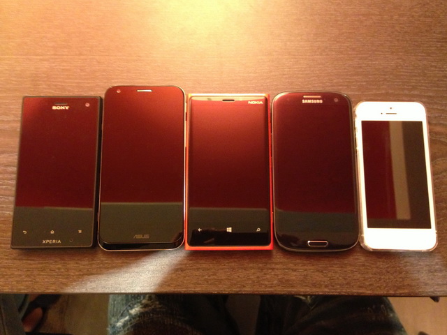 大小比一比,4.3吋Xperia acro S,4.7吋Padfone 2,4.5吋Luma 920,4.8吋Galaxy S3,4吋iPhone 5